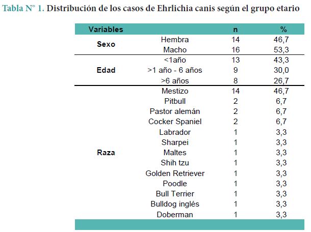 El 85,7% (n=30) de los perros con sintomatología compatible a Ehrlichia canis fue positivo a la inmunocromatografía. El 46,7% era hembra y el 53,3 % macho. Del total de casos observados, el 71,4 % (n=25) estaba infestado por garrapatas.