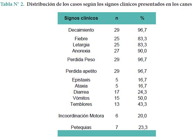 Los perros con Ehrlichia canis presentaron con mayor frecuencia signos inespecíficos como decaimiento, pérdida de peso, pérdida de apetito (96,7%) y anorexia (90,0%). Por otro lado, hubo una baja frecuencia de perros con ataxia y epistaxis (16,70%), incoordinación motora (20%) y petequias (23,3%). En la tabla 2, se observa la frecuencia y distribución de los signos clínicos observados en los perros con diagnóstico positivo a Ehrlichia canis.